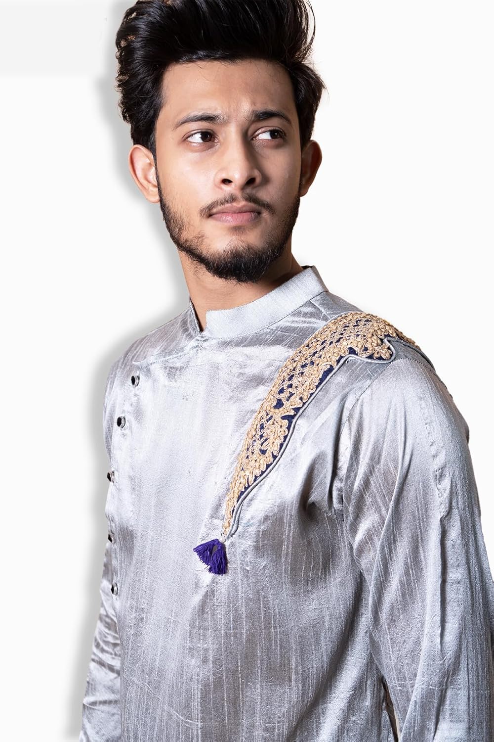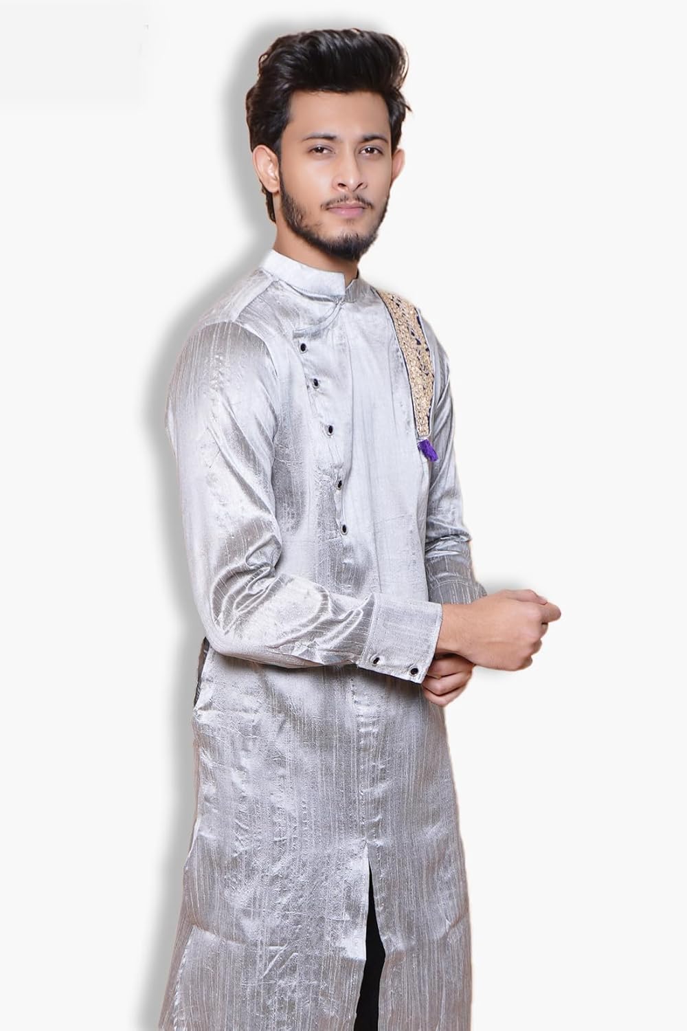 - DESIGN FEATURES: Stylish Steel Grey kurta with mandarin collar with overlap side buttons, embroidery on one shoulder and full sleeves
