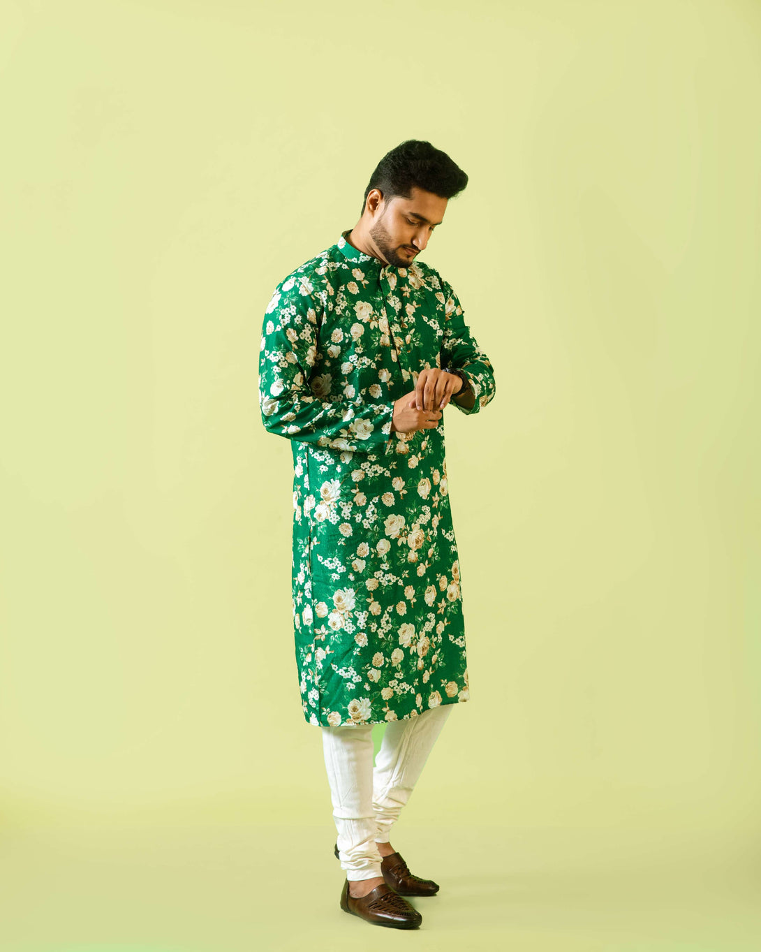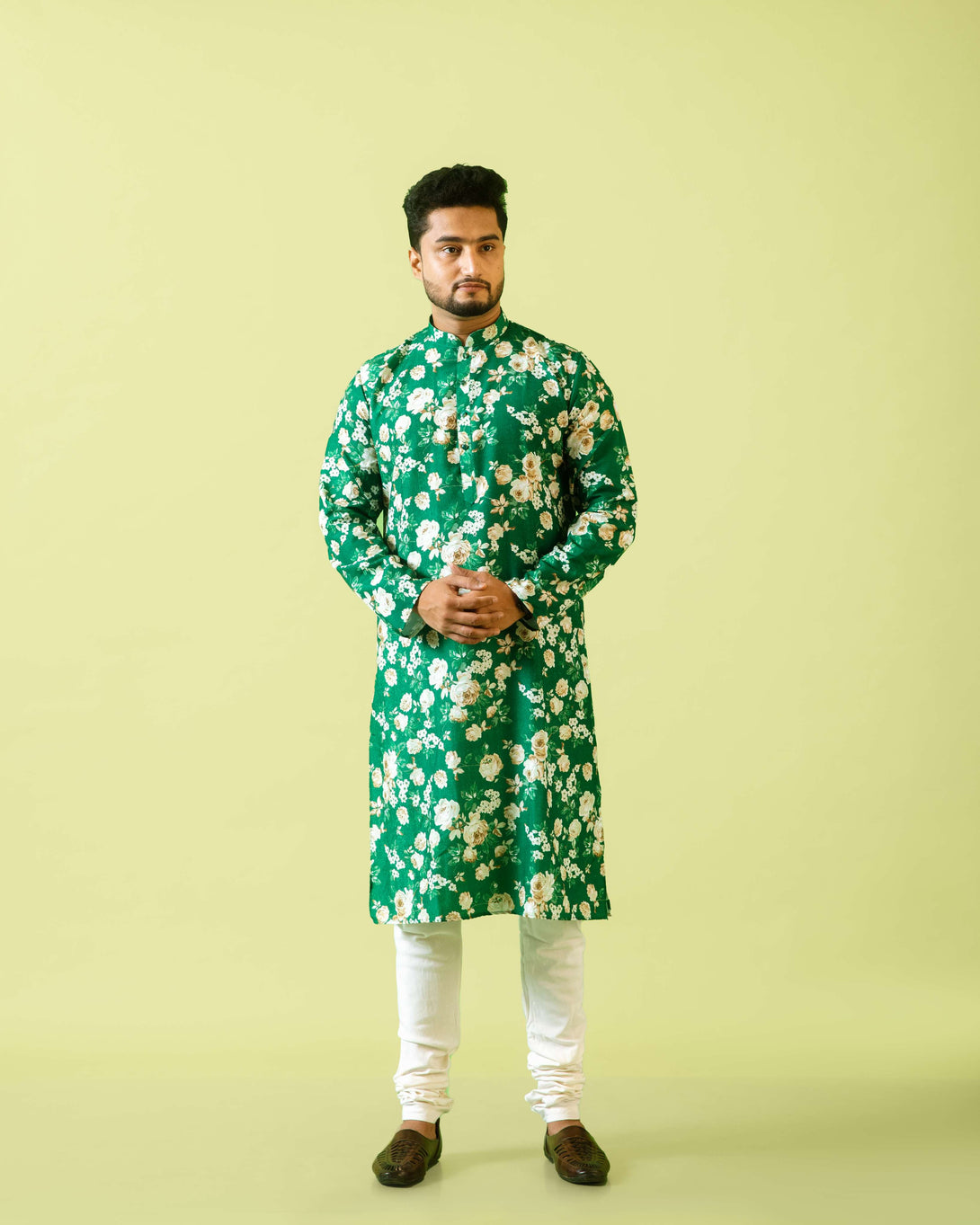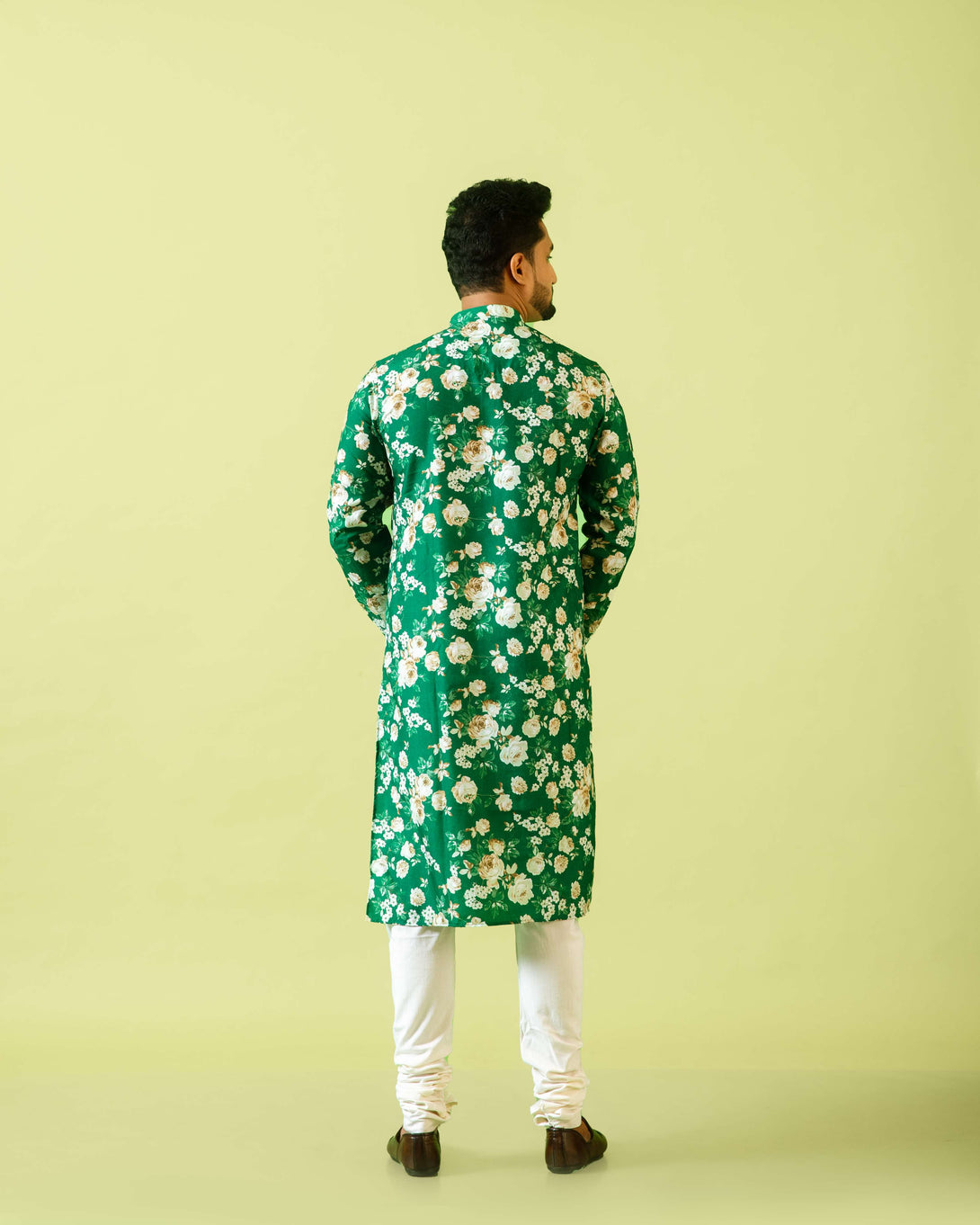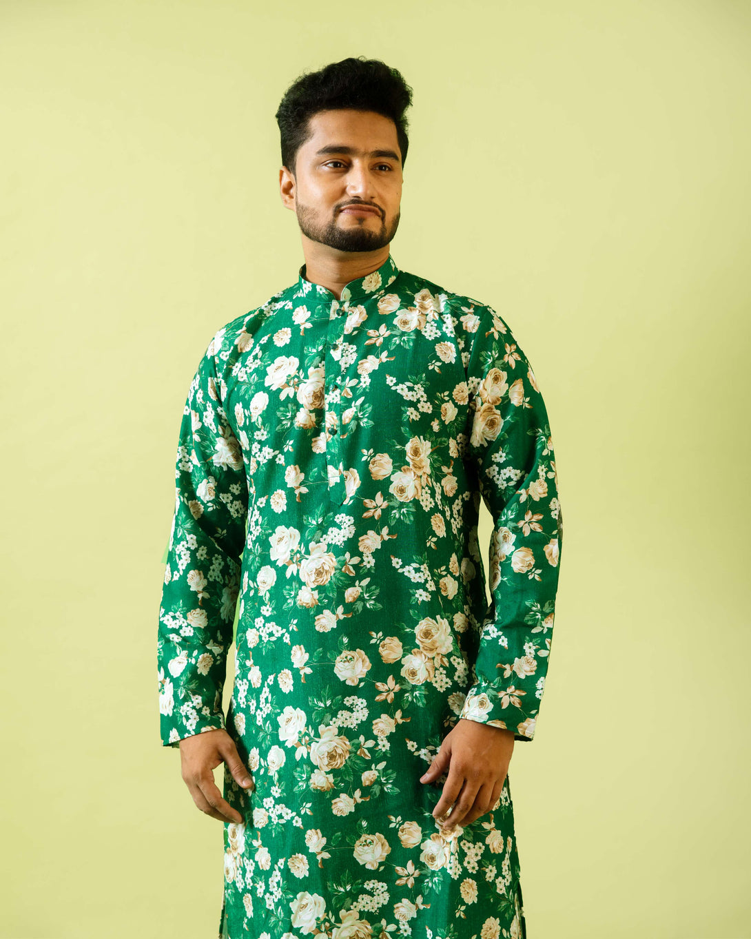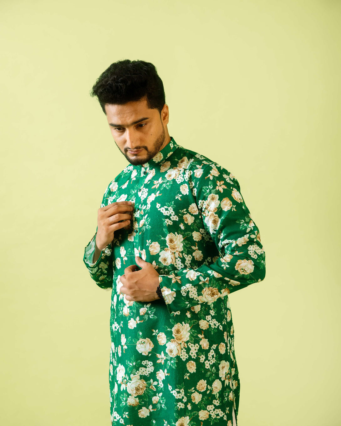 Men's Green Floral Printed Kurta | Cotton Fabric | Casual & Festive Wear
