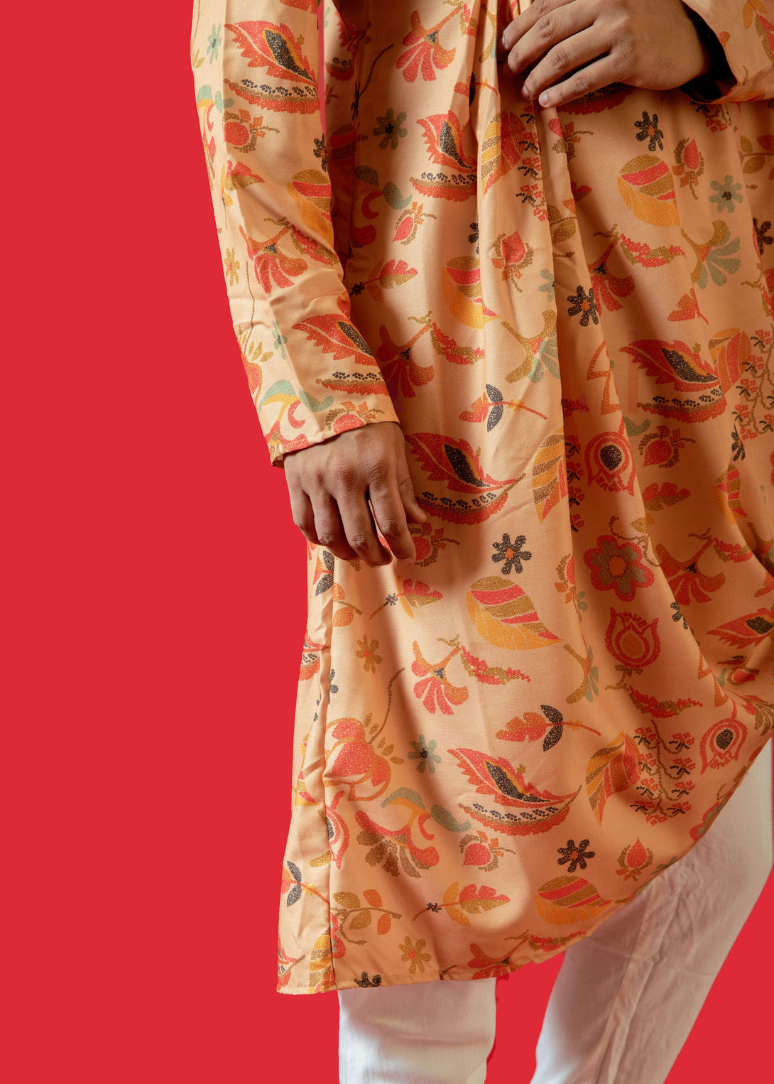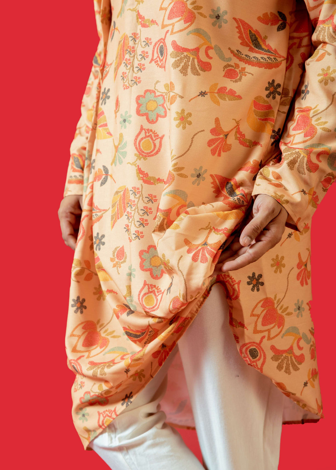 - DESIGN FEATURES: Stylish Pastel Orange printed kurta with mandarin collar and full sleeves, asymmetrical kurta