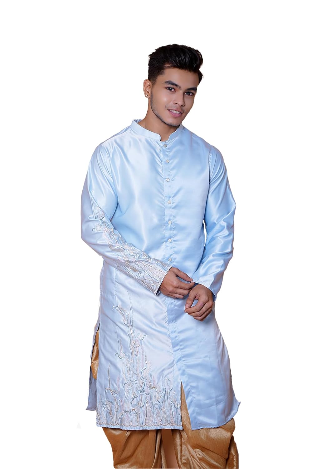 - DESIGN FEATURES: Stylish Light Blue Sherwani with mandarin collar, full sleeves with embroidery detailing