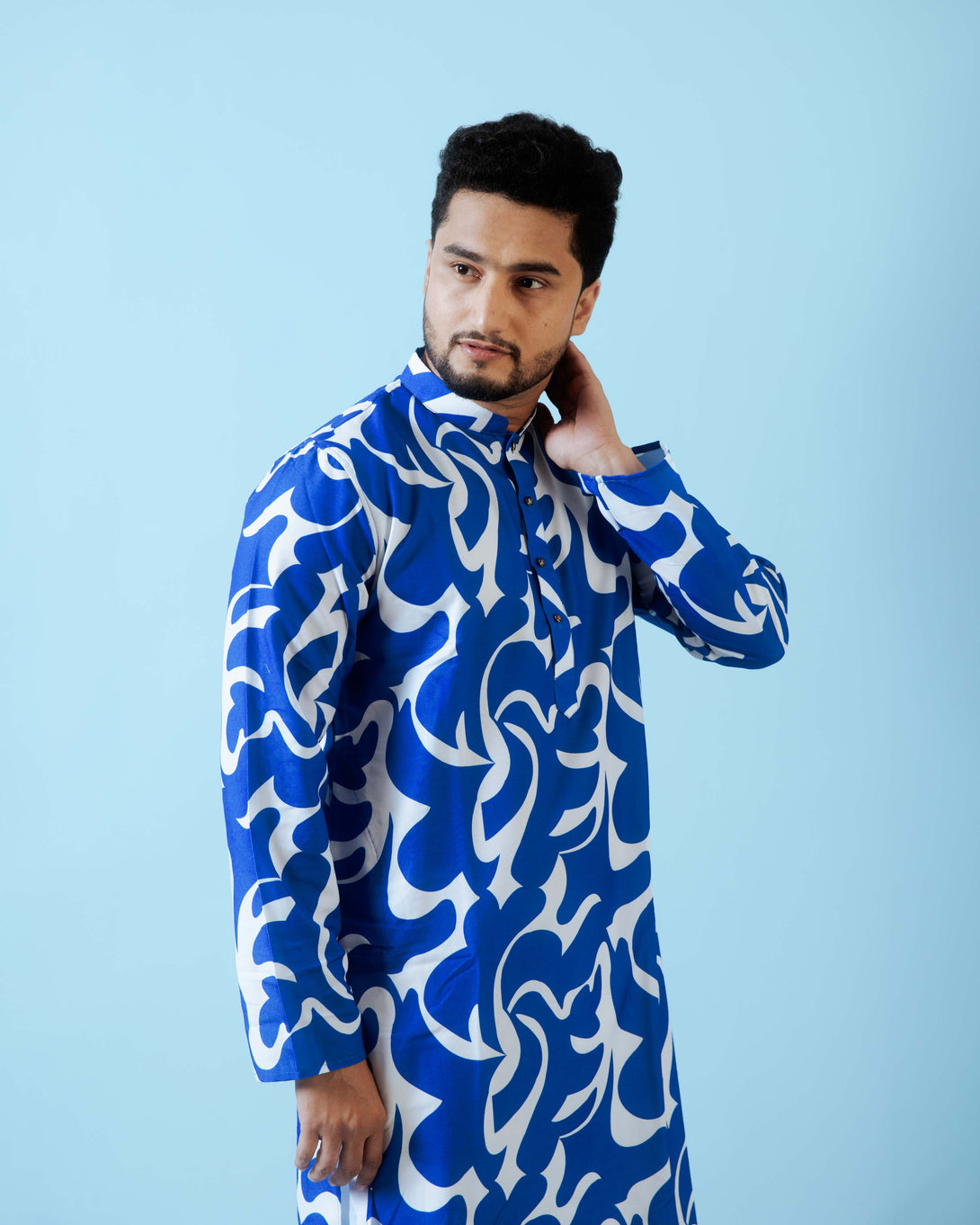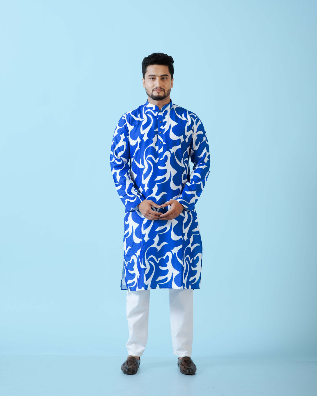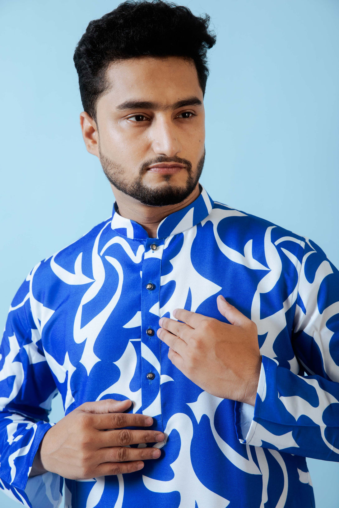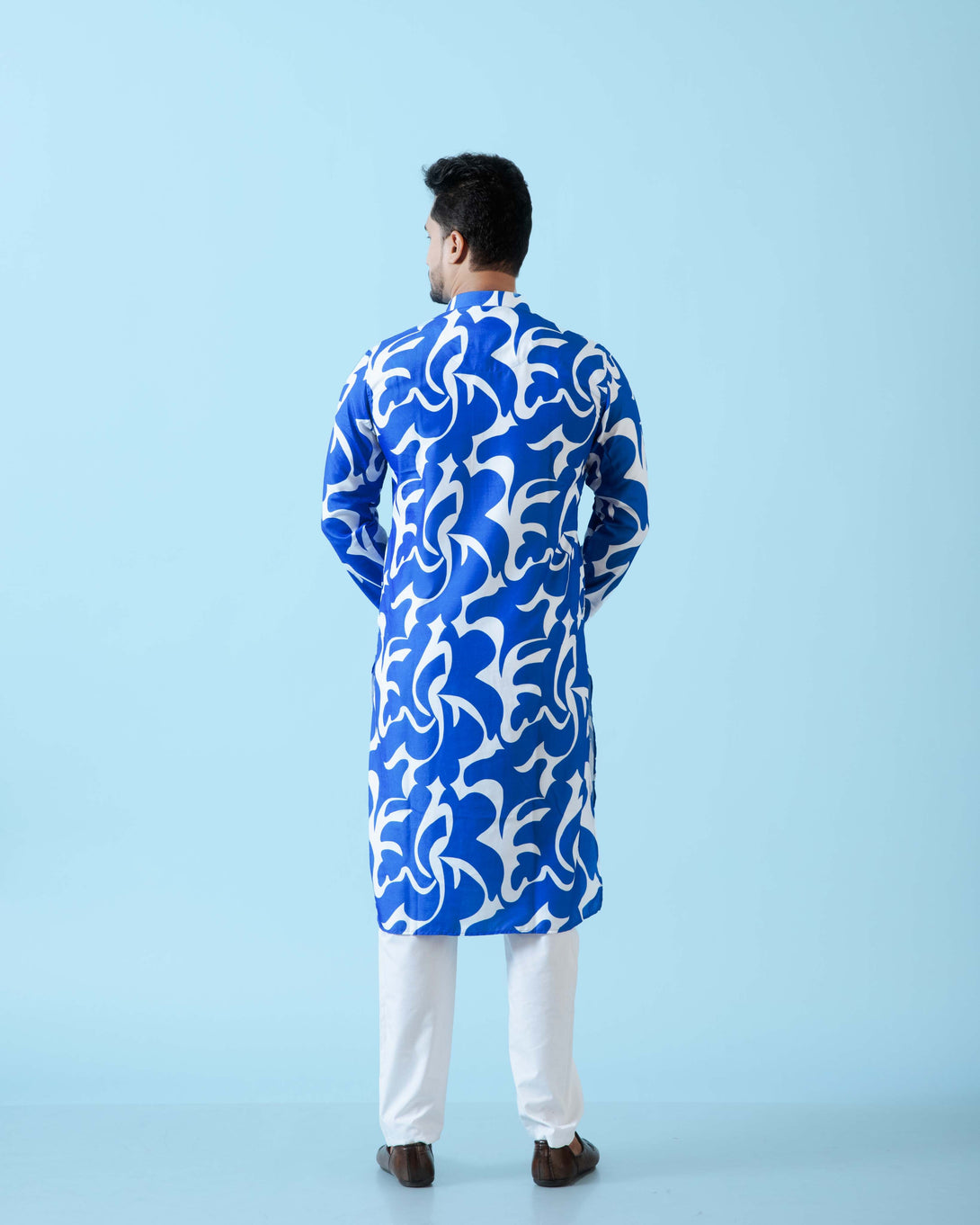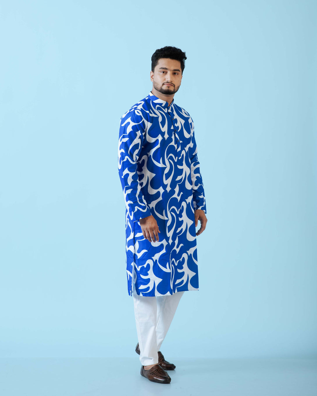 - DESIGN FEATURES: Stylish Blue & White printed kurta with mandarin collar and full sleeves