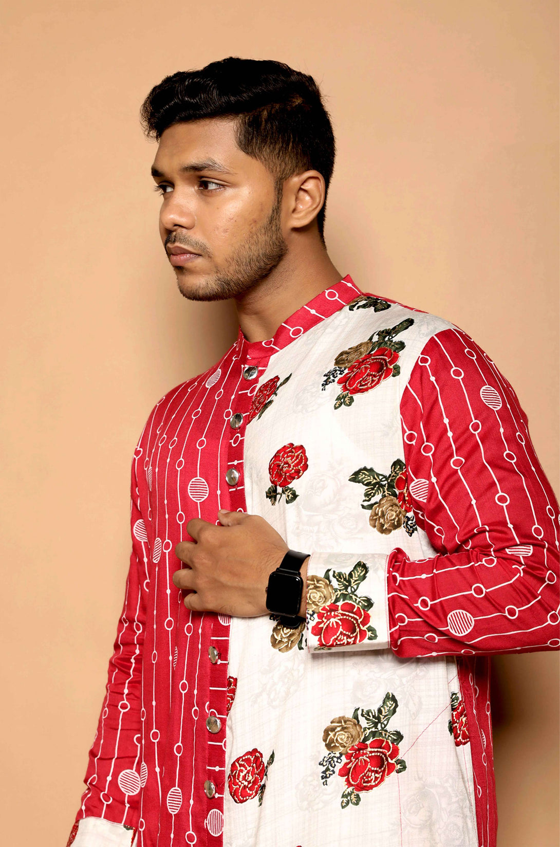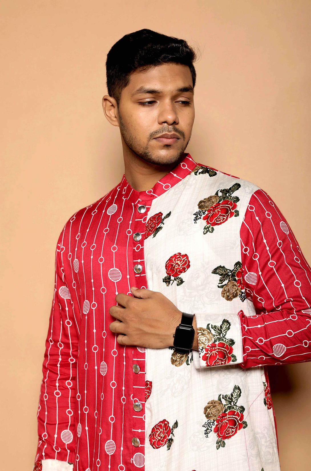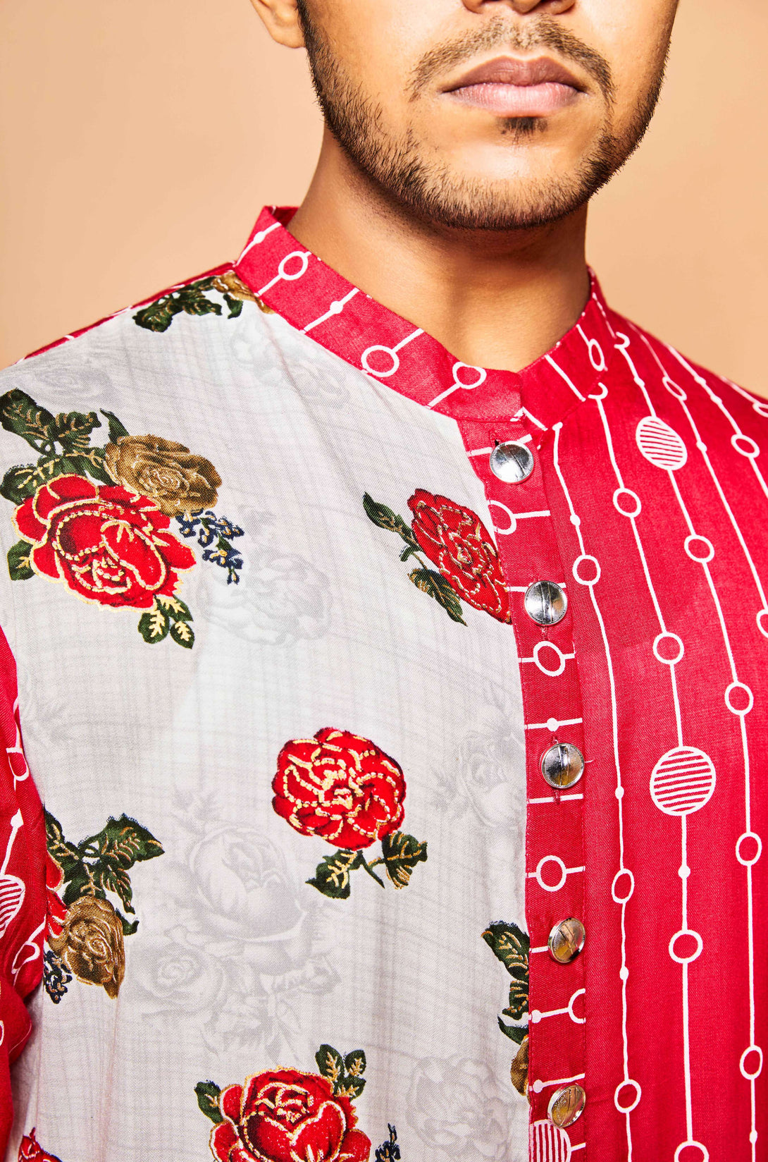 - DESIGN FEATURES: Stylish Red & White half-n-half kurta with mandarin collar and full sleeves, one side geometric and one side floral and foldable sleeves