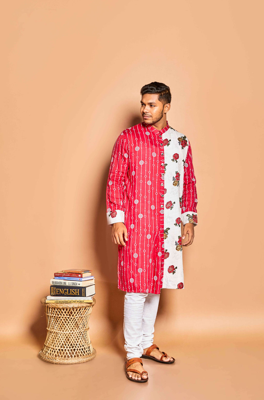 Men's Red & White Half-n-Half Kurta | Cotton Fabric| Casual & Festive Wear
