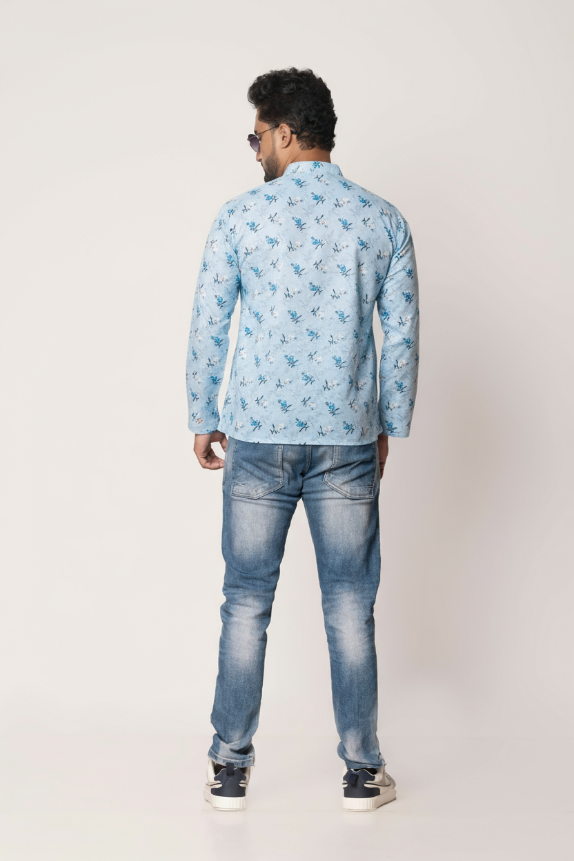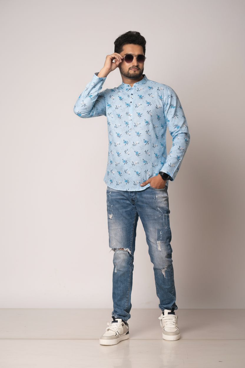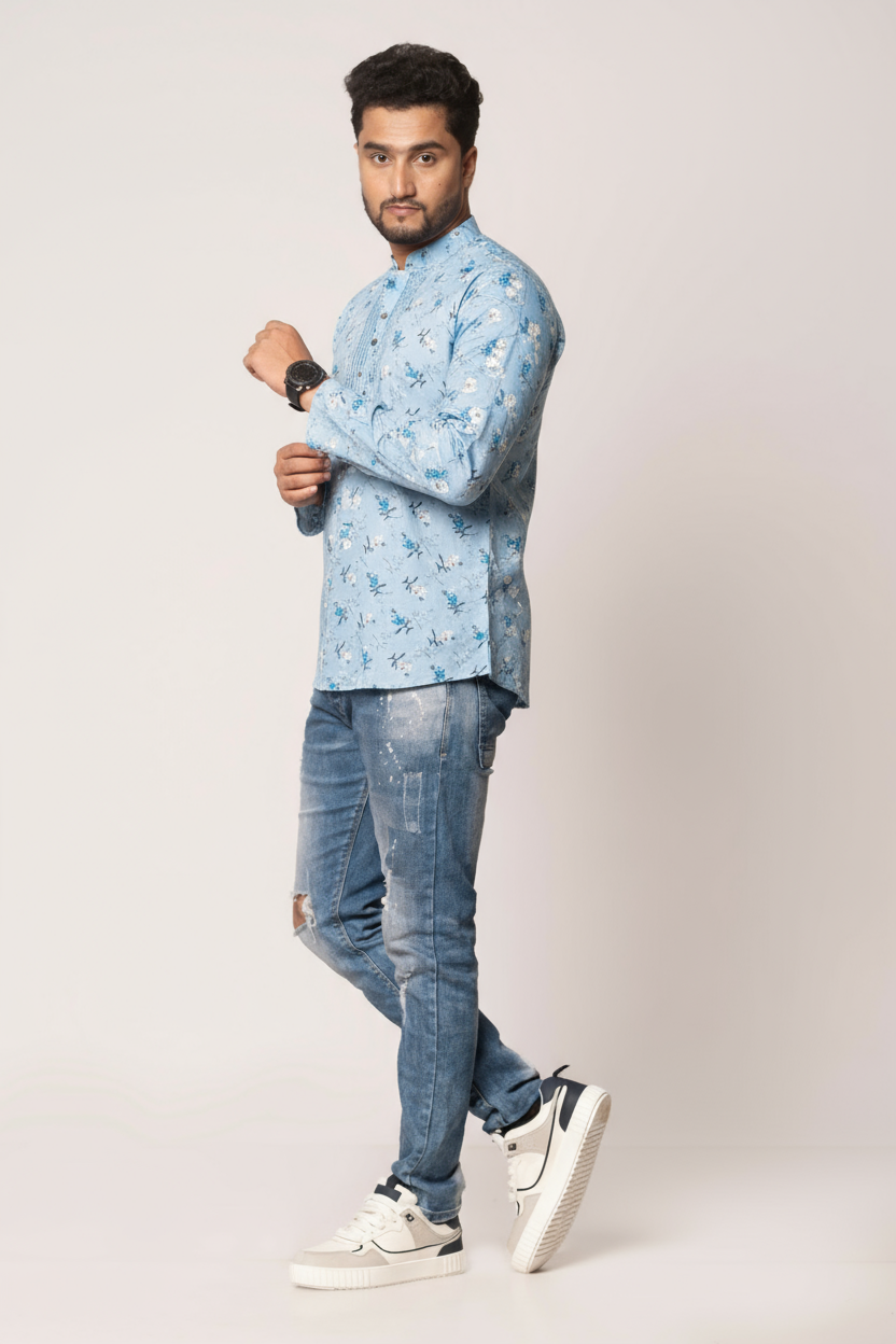 Men's Light Blue Printed Short Kurta | Cotton Fabric | Semi Formal & Casual Wear