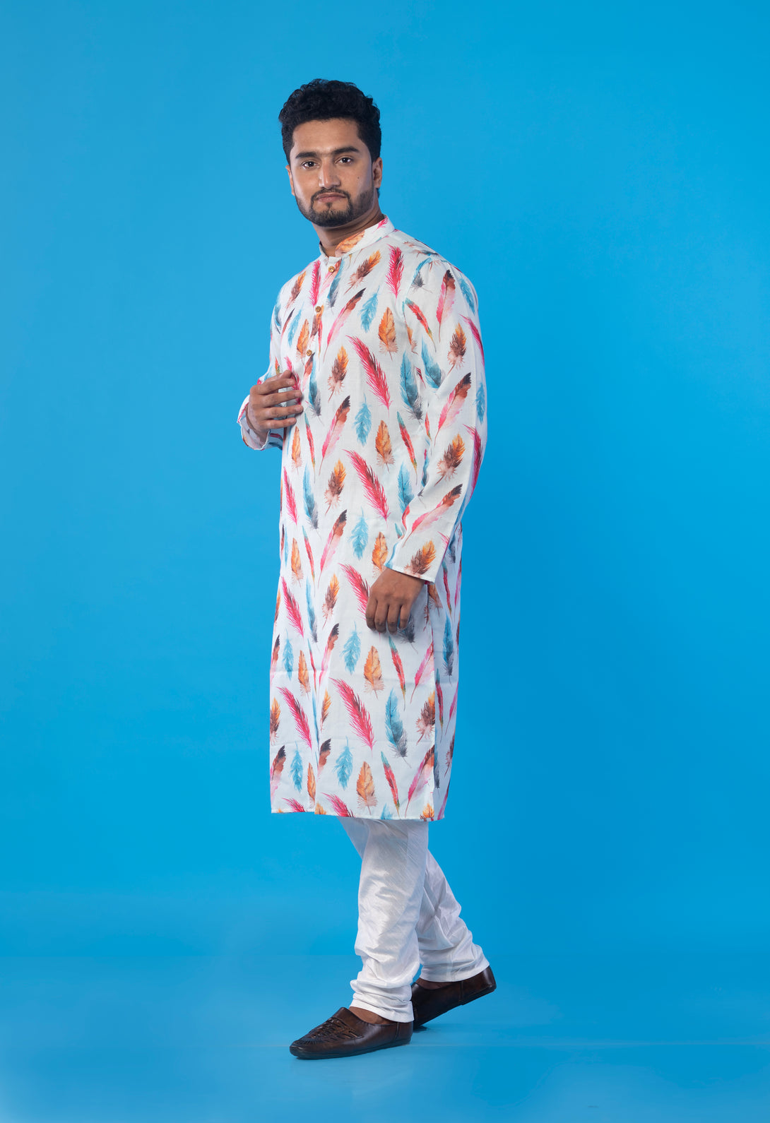 - DESIGN FEATURES: Stylish White multicoloured feather printed kurta with mandarin collar and full sleeves