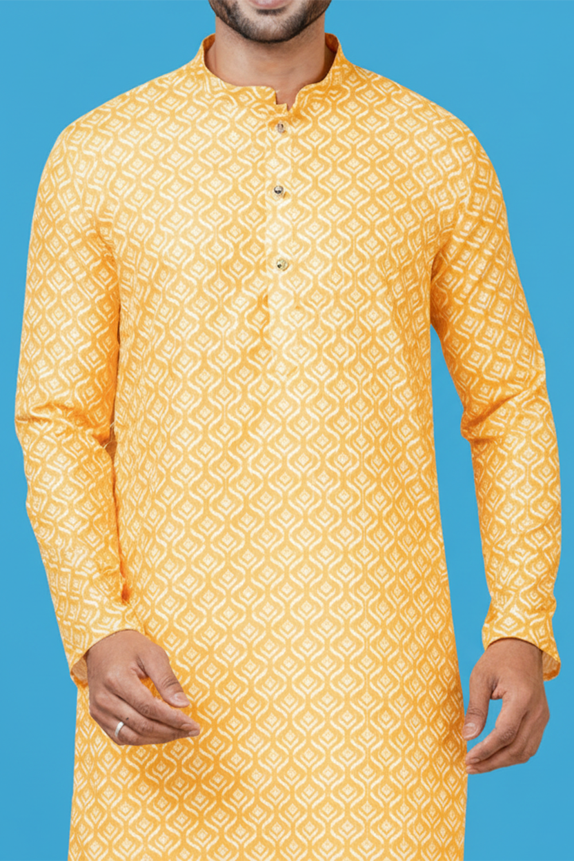 Men’s Yellow Printed Kurta | Cotton Fabric | Ethnic & Casual Wear
