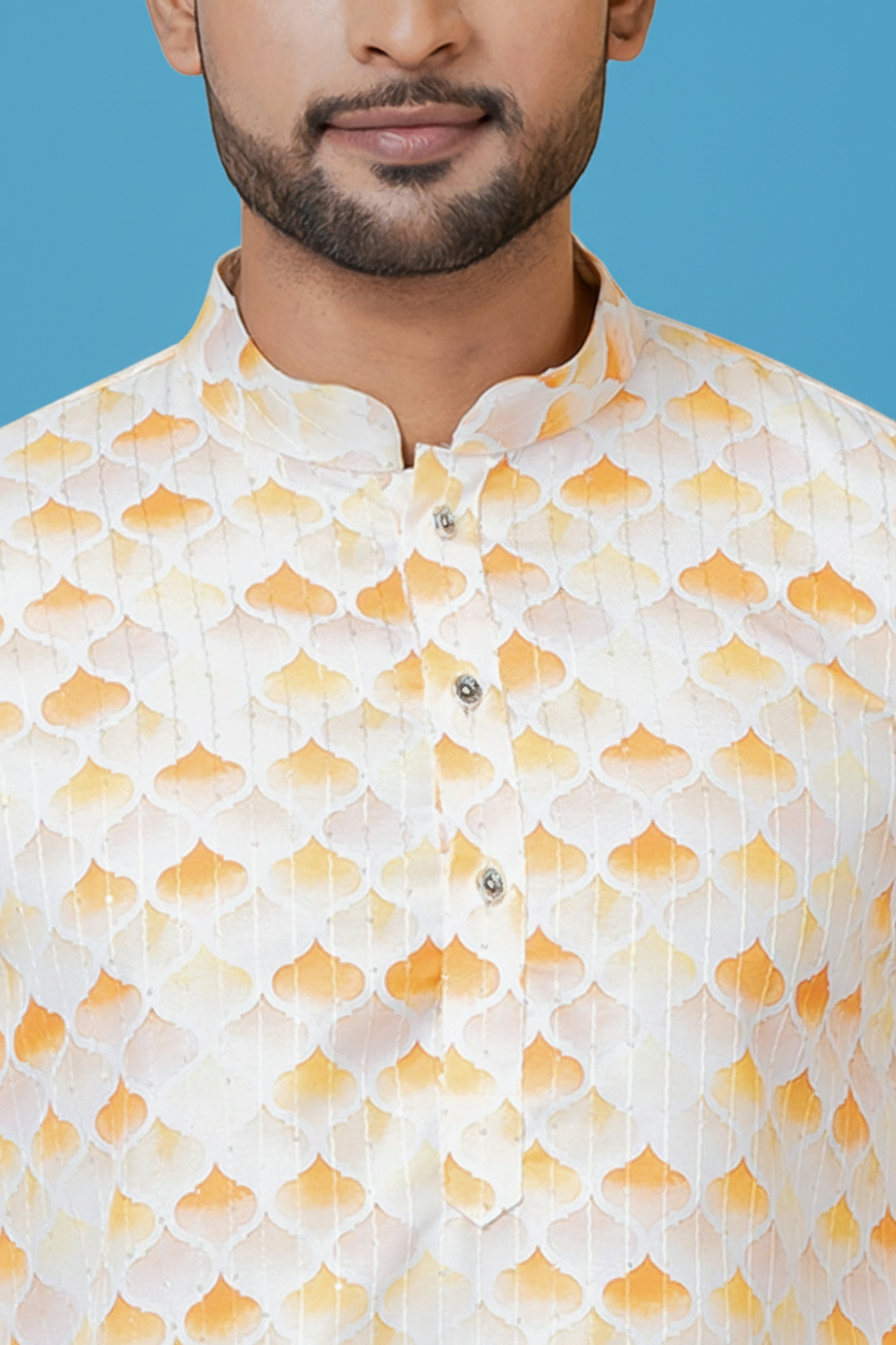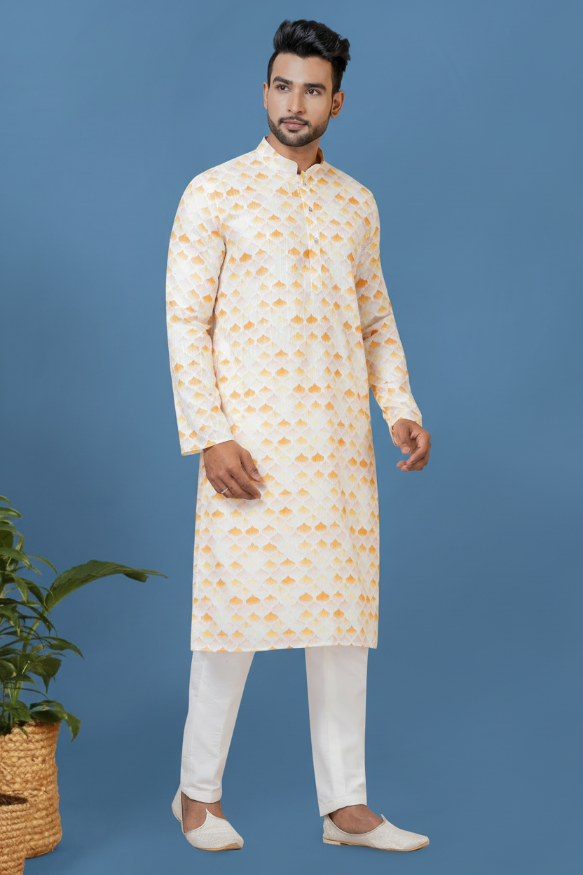Men’s Yellow & White Printed Kurta | Cotton Fabric | Ethnic & Casual Wear