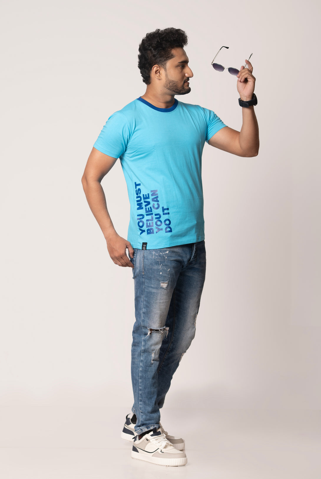 - DESIGN FEATURES: Stylish Light Blue Round neck t-shirt with contrast Navy Blue neck line, Navy Blue caption on one side