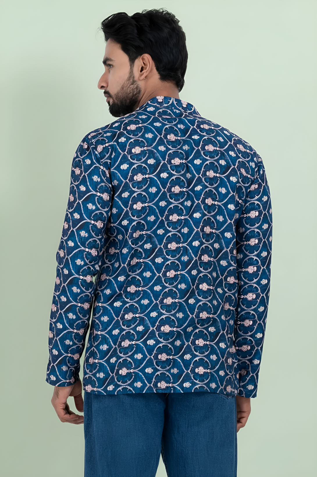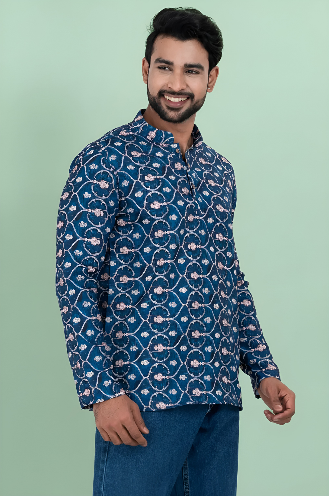 Men's Blue Printed Short Kurta | Cotton Fabric | Semi Formal & Casual Wear