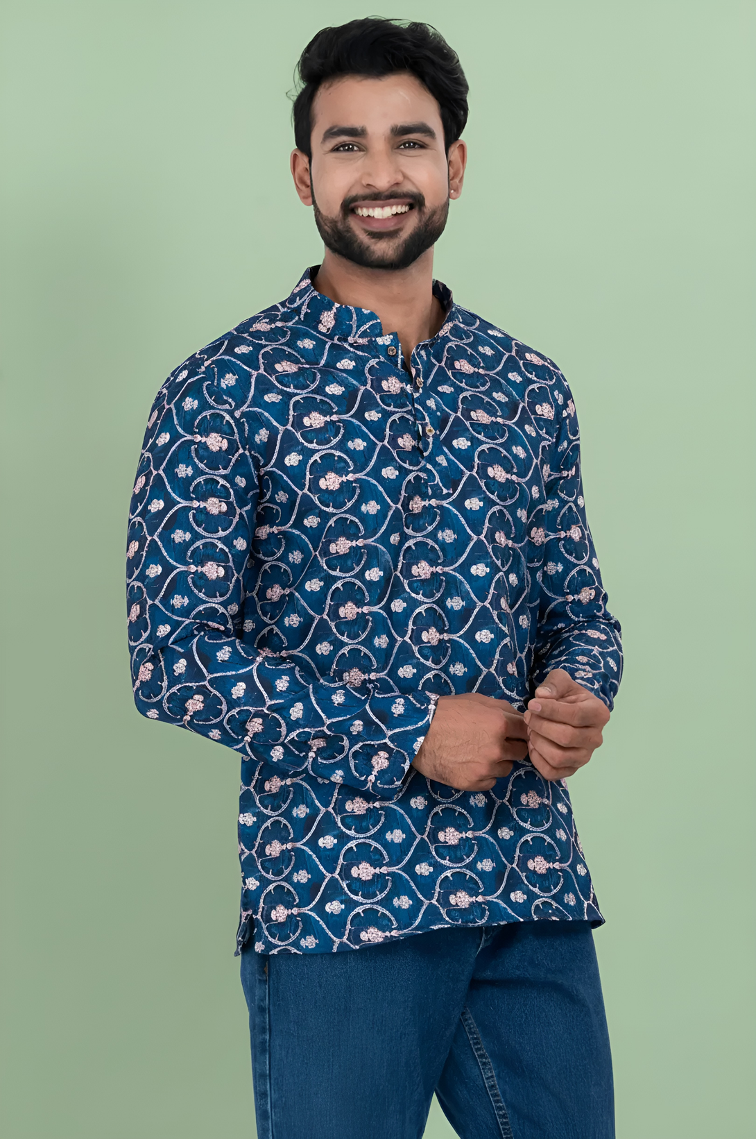 - DESIGN FEATURES: Stylish Blue floral printed short kurta with mandarin collar and full sleeves