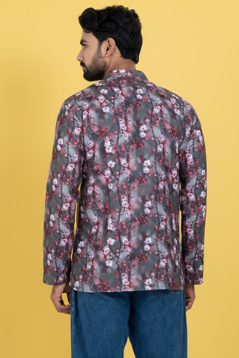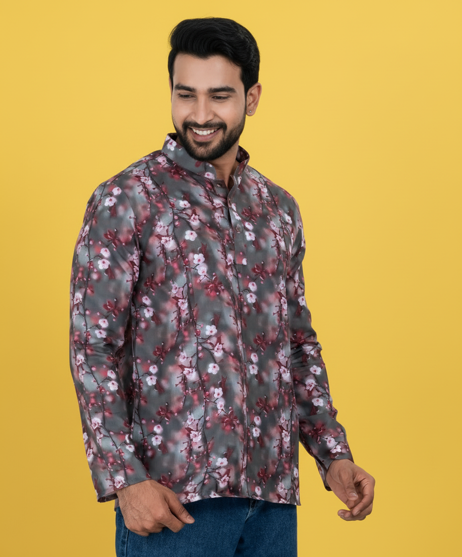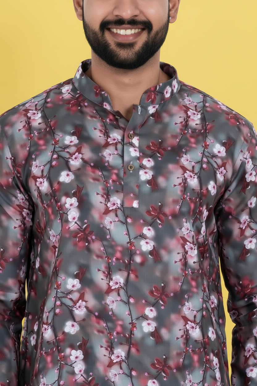 Men's Grey Pink Printed Short Kurta | Cotton Fabric | Semi Formal & Casual Wear
