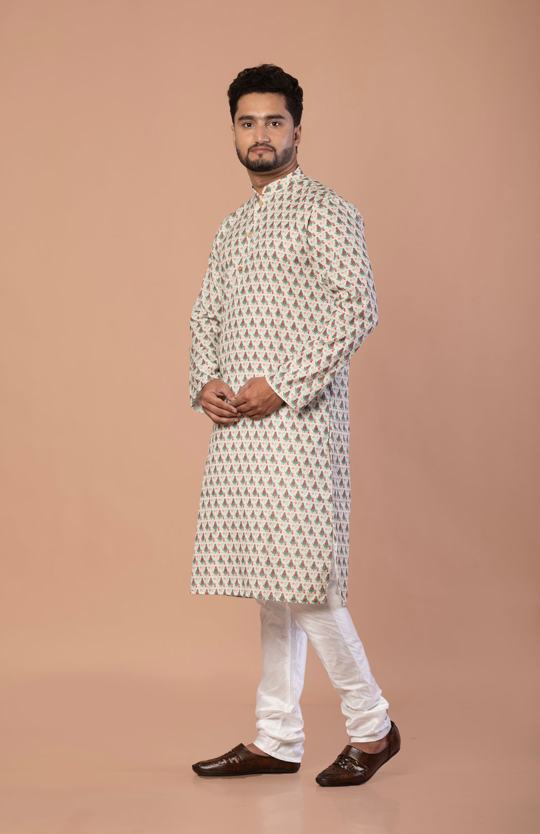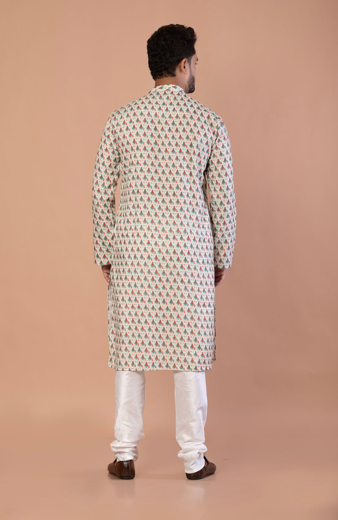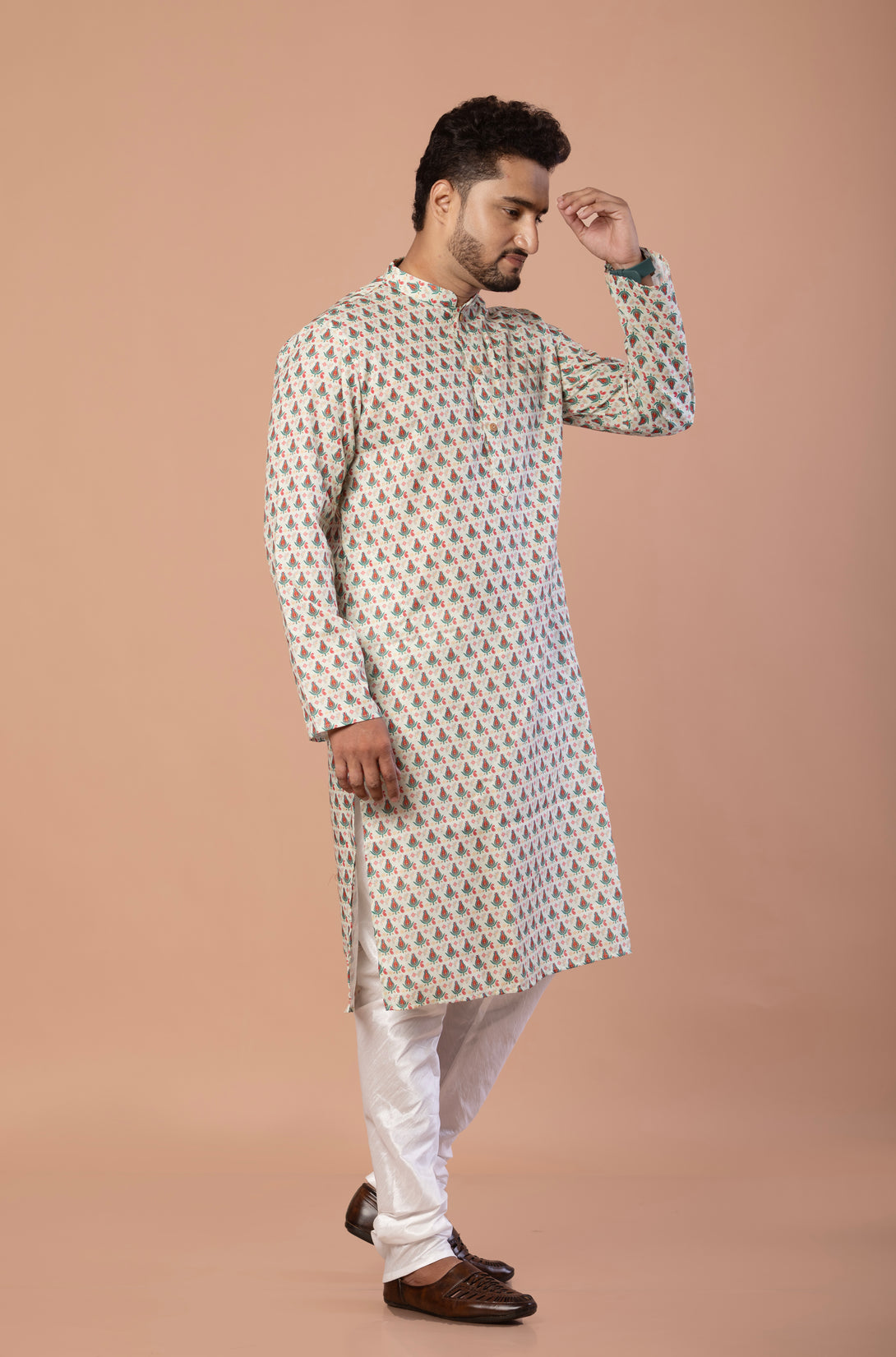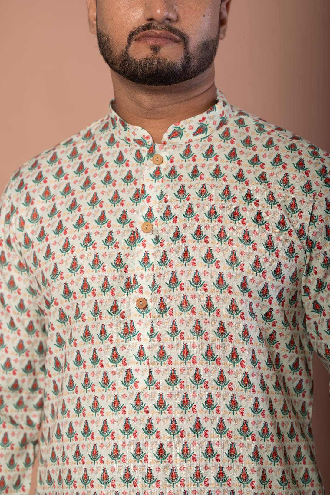Men's Light Beige Floral Printed Kurta | Cotton Fabric | Ethnic & Casual Wear