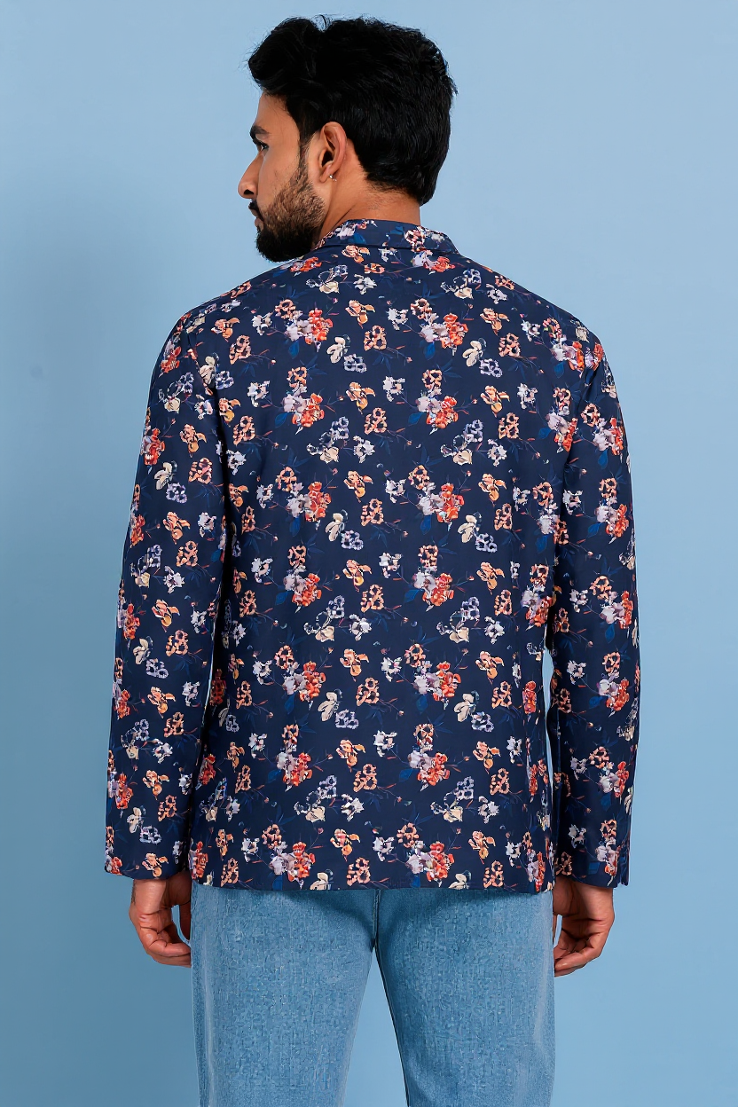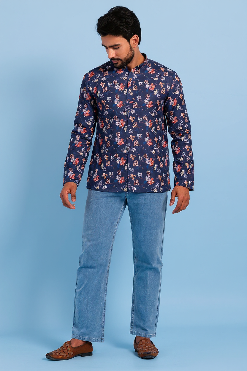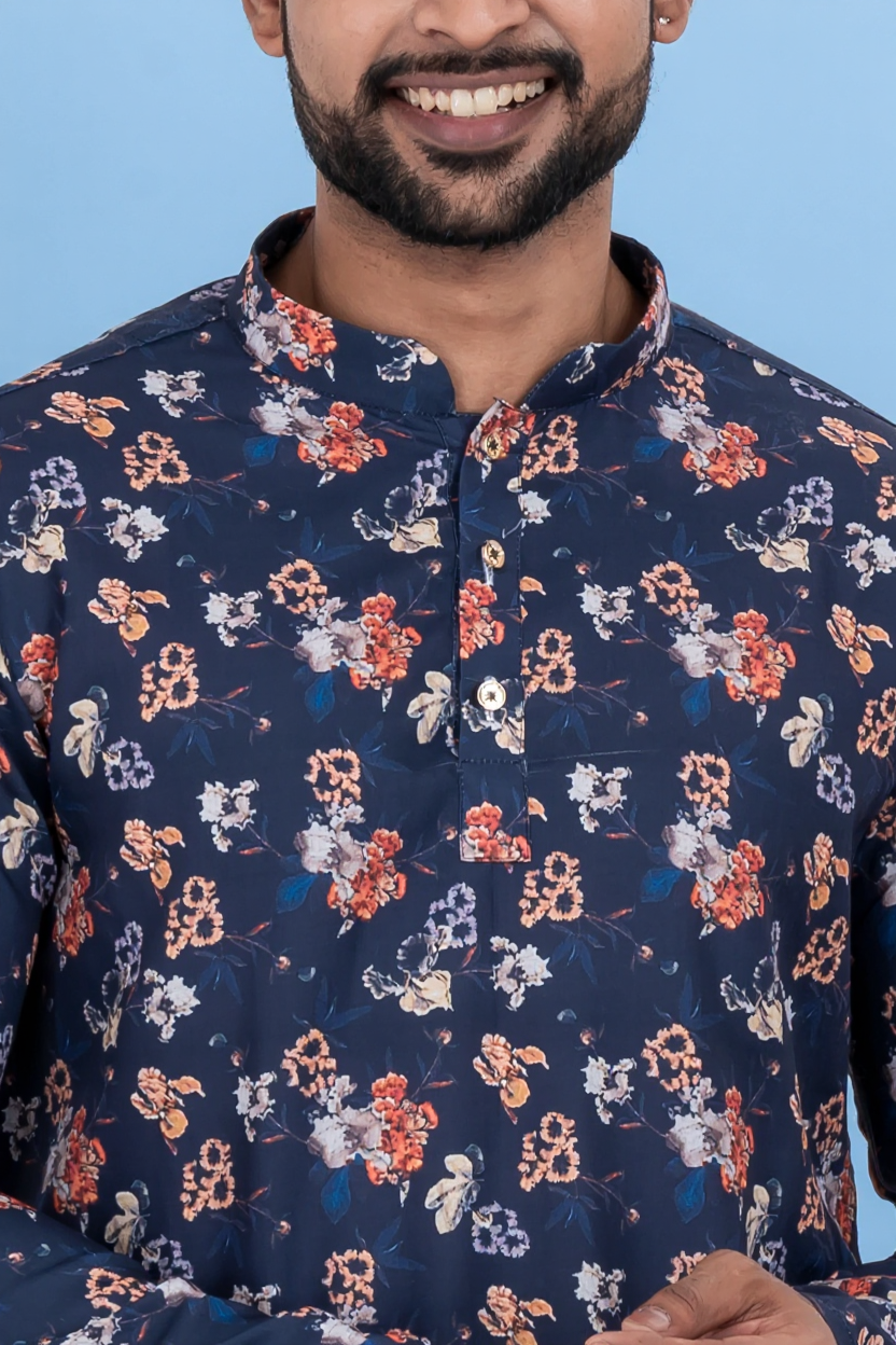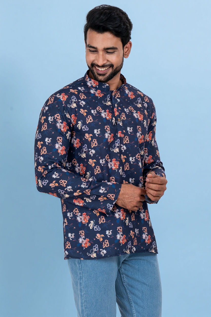- DESIGN FEATURES: Stylish Navy Blue floral printed short kurta with mandarin collar and full sleeves
