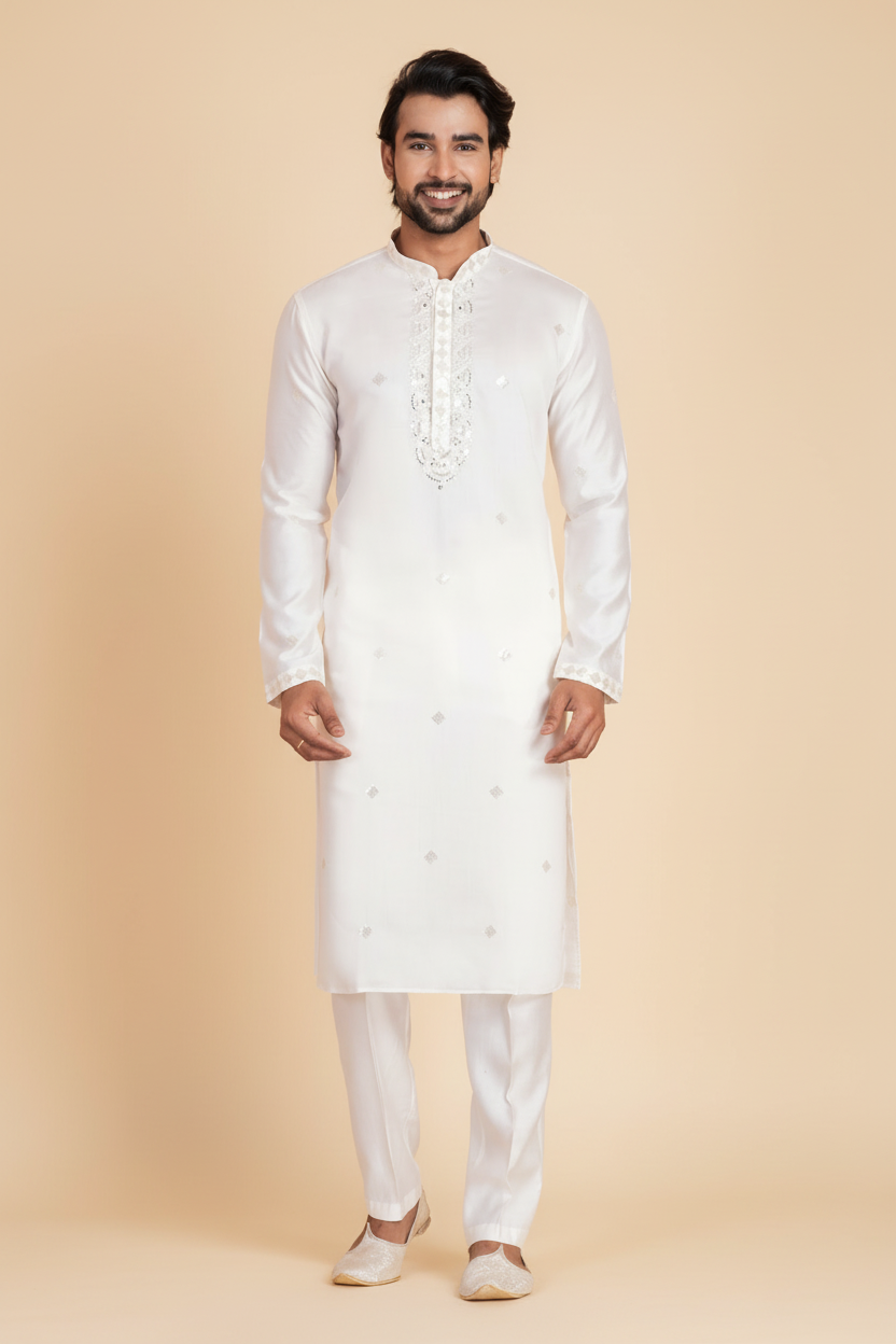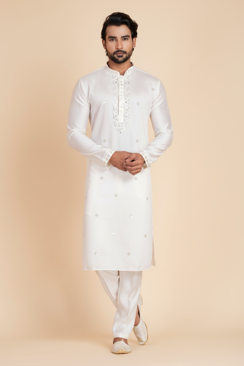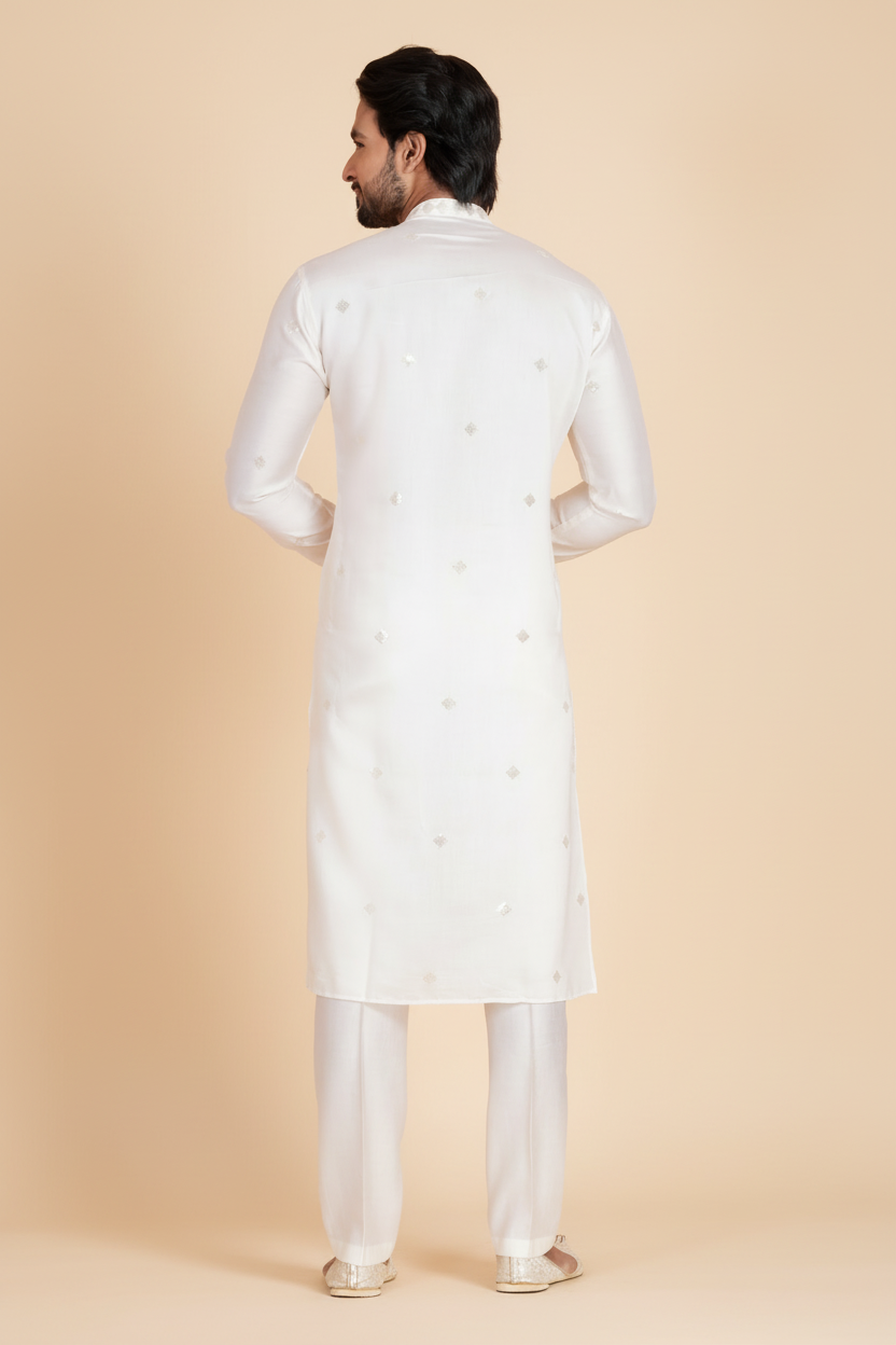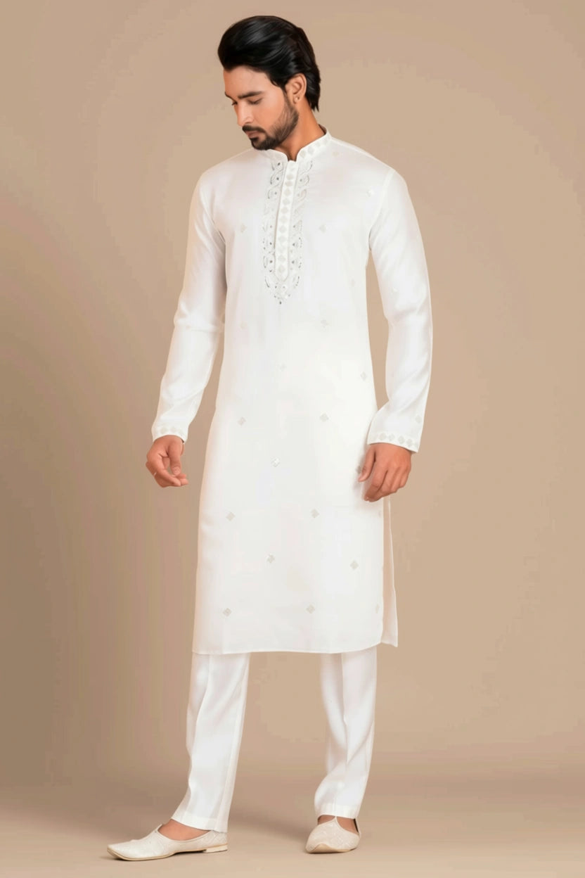 - DESIGN FEATURES: Stylish Pure White kurta with mandarin collar and full sleeves with all-over work