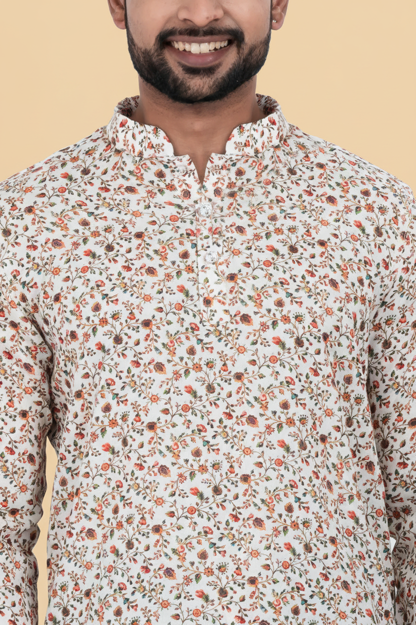 Men's White Printed Short Kurta | Cotton Fabric | Semi Formal & Casual Wear
