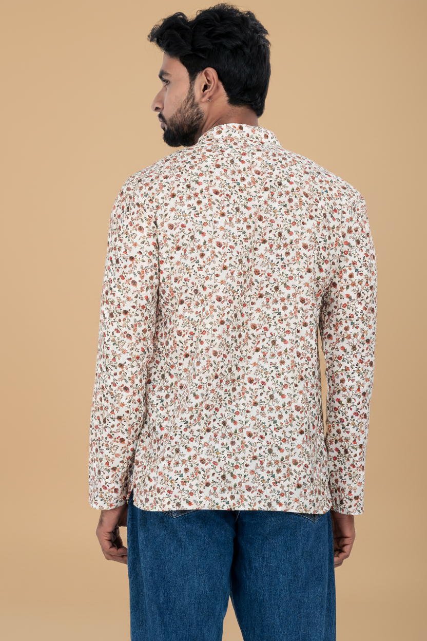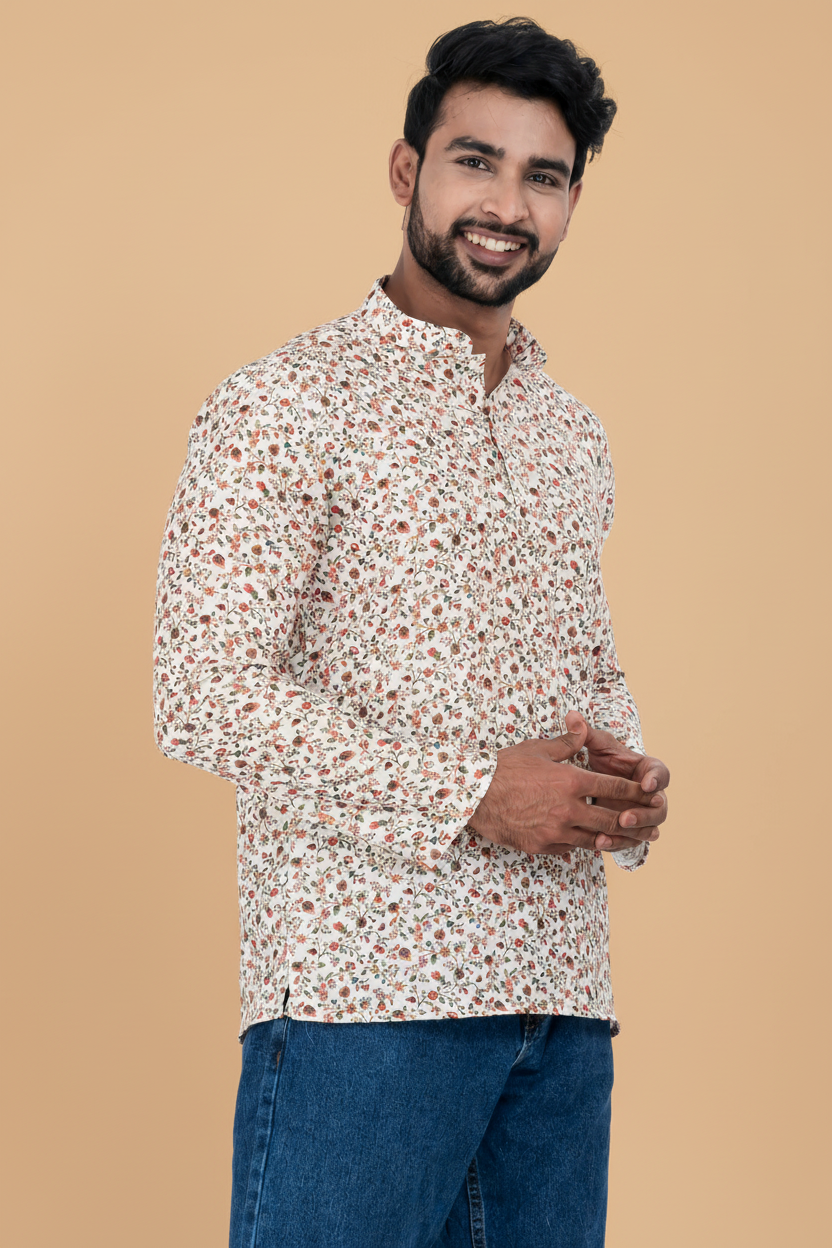 - DESIGN FEATURES: Stylish White floral printed short kurta with mandarin collar and full sleeves