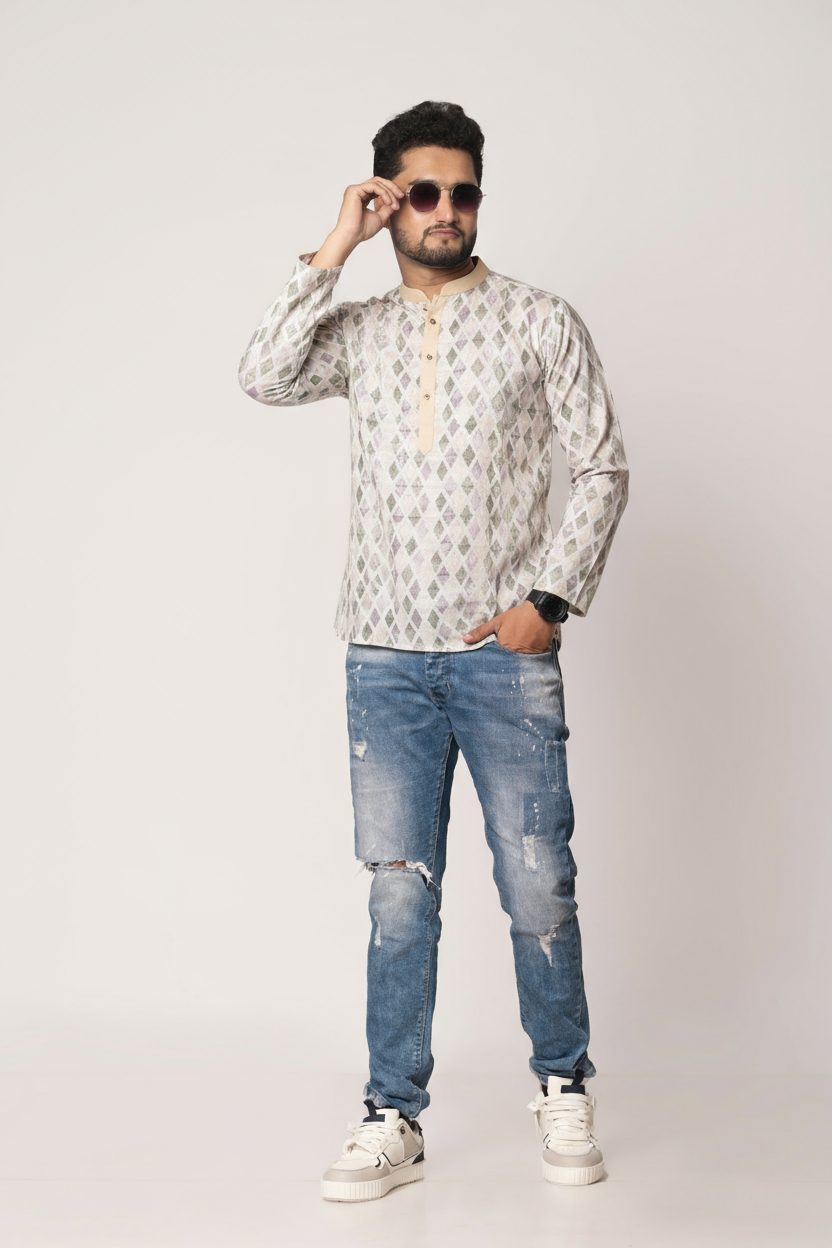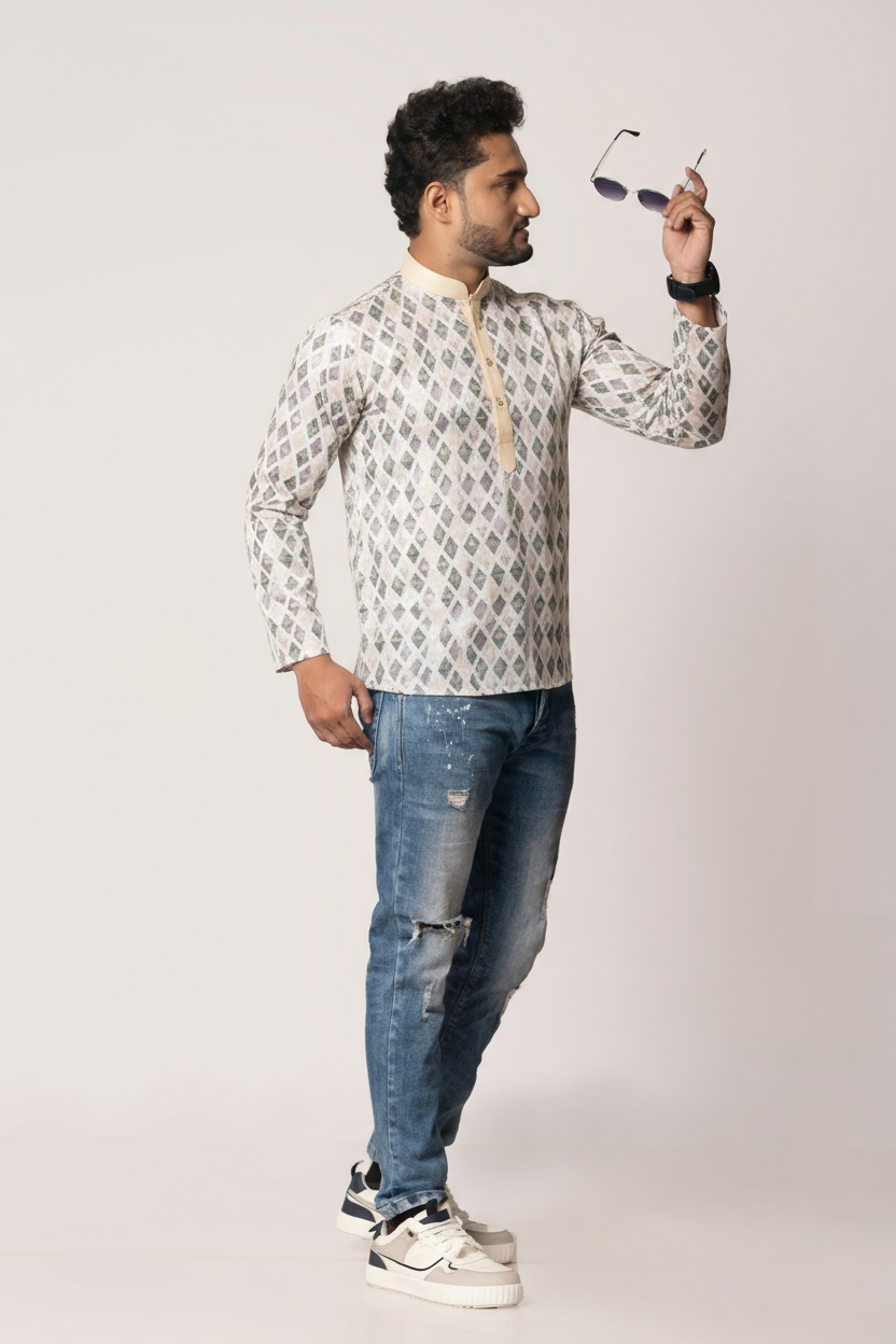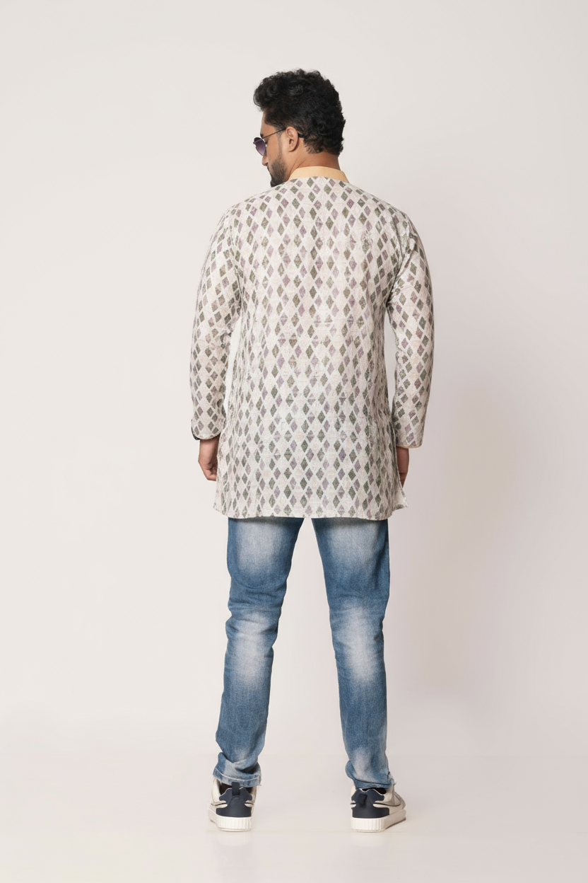 Men's White Printed Short Kurta | Cotton Fabric | Semi Formal & Casual Wear